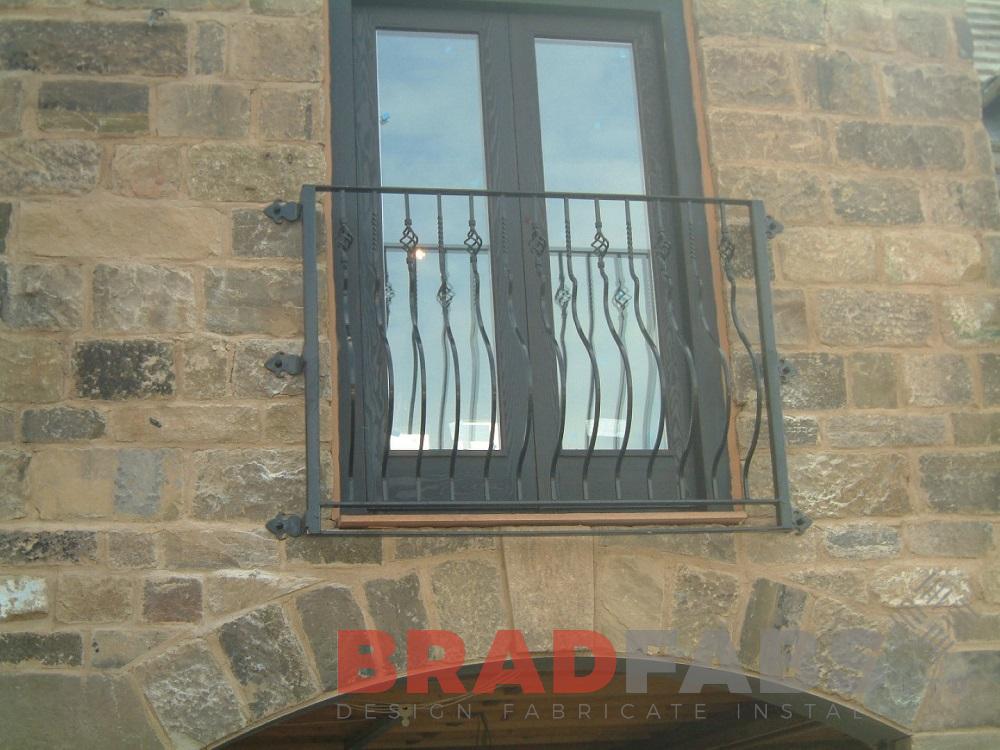 This mild steel balconette with curved bars and twisted baskets balustrading is galvanized for weather protection, finished by powder coating in black and installed in Leeds, West Yorkshire.