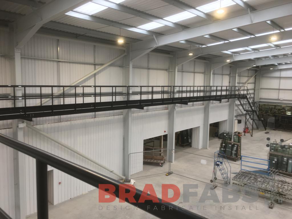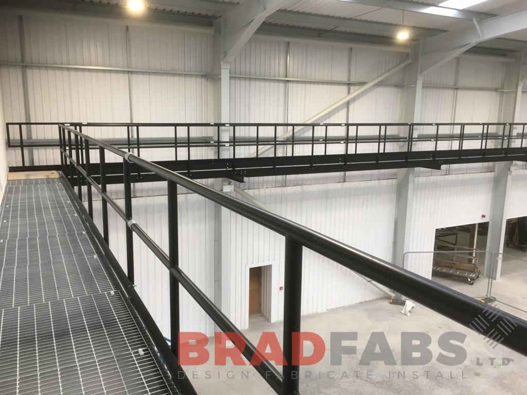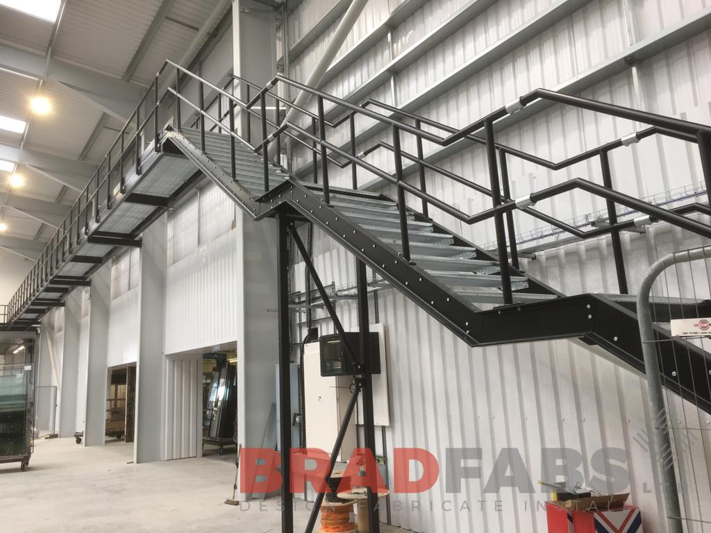 Large walkway leading to a straight staircase for a workplace project, manufactured in mild steel and powder coated, complete with mesh treads bespoke by Bradfabs